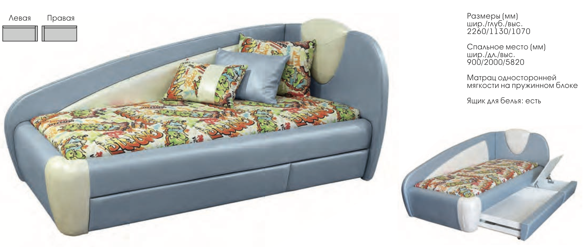 —Тахта Угловая Лейла с Ящиком для Хранения и Матрасом/Разные Цвета 900 х 2000 мм
