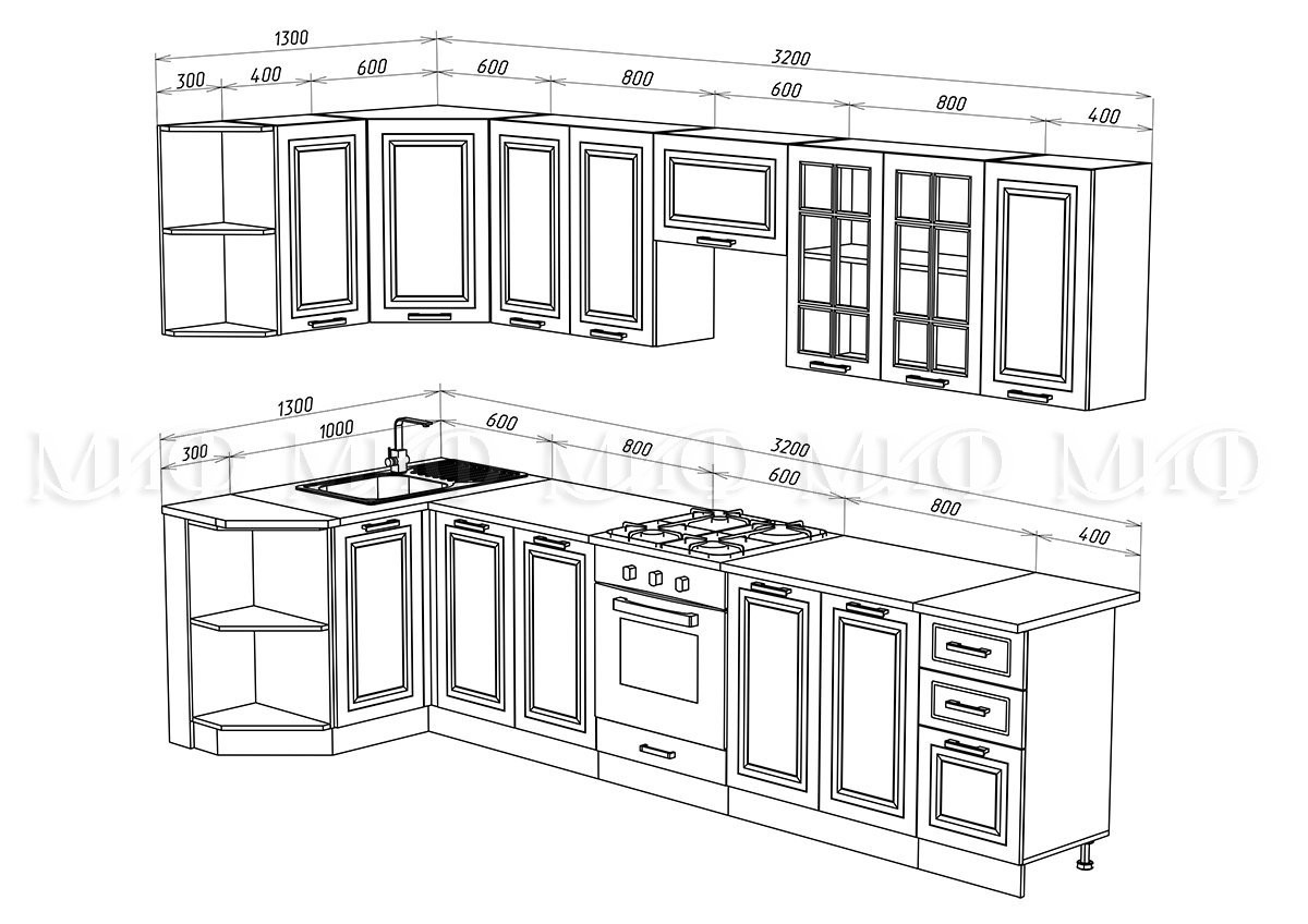 • Ширина 1300  х 3200 мм (мм)  x Глубина 600 по столешнице/корпус 450 (мм)  х Высота 830 (мм)
